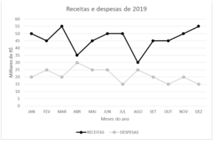 Na reunião de planejamento inicial do ano de uma empresa foram apresentadas aos sócios as evoluções de receitas e despesas do ano anterior, aproximadas, a partir do gráfico a seguir: